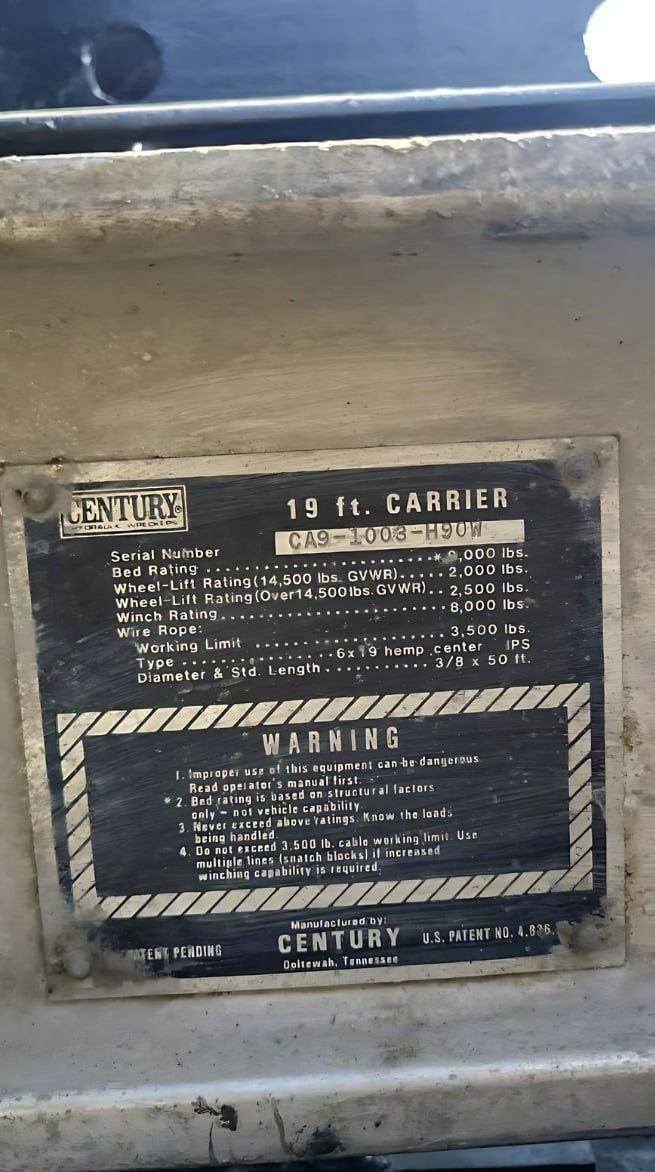 Marca de Camion: Ford. Modelo del Camion: f550 año 2001. Motor: 7.3L Powerstroke Diesel, V8. Combustible: Diesel. Transmisión: Automatica de 6 velocidades. Frenos: Disco. Marca del Equipo: Century. Capacidad del Equipo: 4 toneladas. Largo de la Plataforma: 19 pies . Material de Plataforma: Aluminio. Incluye Winch de 8,000 libras y Wheel Lift de 3,500 libras. Unidad se entrega con placas federales, pedimento y factura.