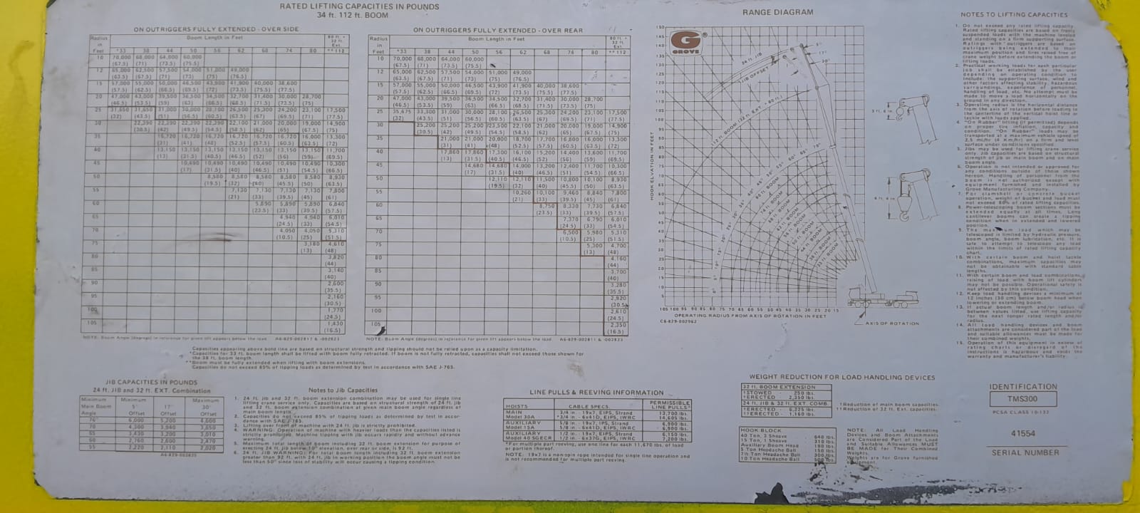 Marca: Grove, Modelo: TMS 300, Año: 1978, Motor: Detroit, Transmisión: Estándar, 13 Velocidades, Capacidad: 35 Toneladas, Alcance: 33 Metros + Jiba, Equipo importado, papelería en regla. (Equipo se encuentra en Huinala)